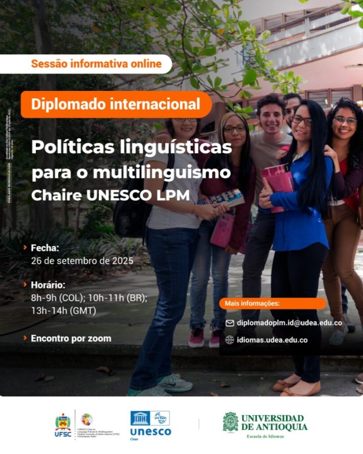 A Cátedra Unesco de Políticas Linguísticas para o Multilinguismo (CPLM), em parceria com a Secretaria de Relações Internacionais (SINTER), disponibilizará vagas para docentes da UFSC participarem do Diplomado Internacional “Políticas Linguísticas para o Multilinguismo – Cátedra UNESCO”, uma proposta acadêmica para refletir criticamente sobre o papel do multilinguismo nas sociedades contemporâneas.