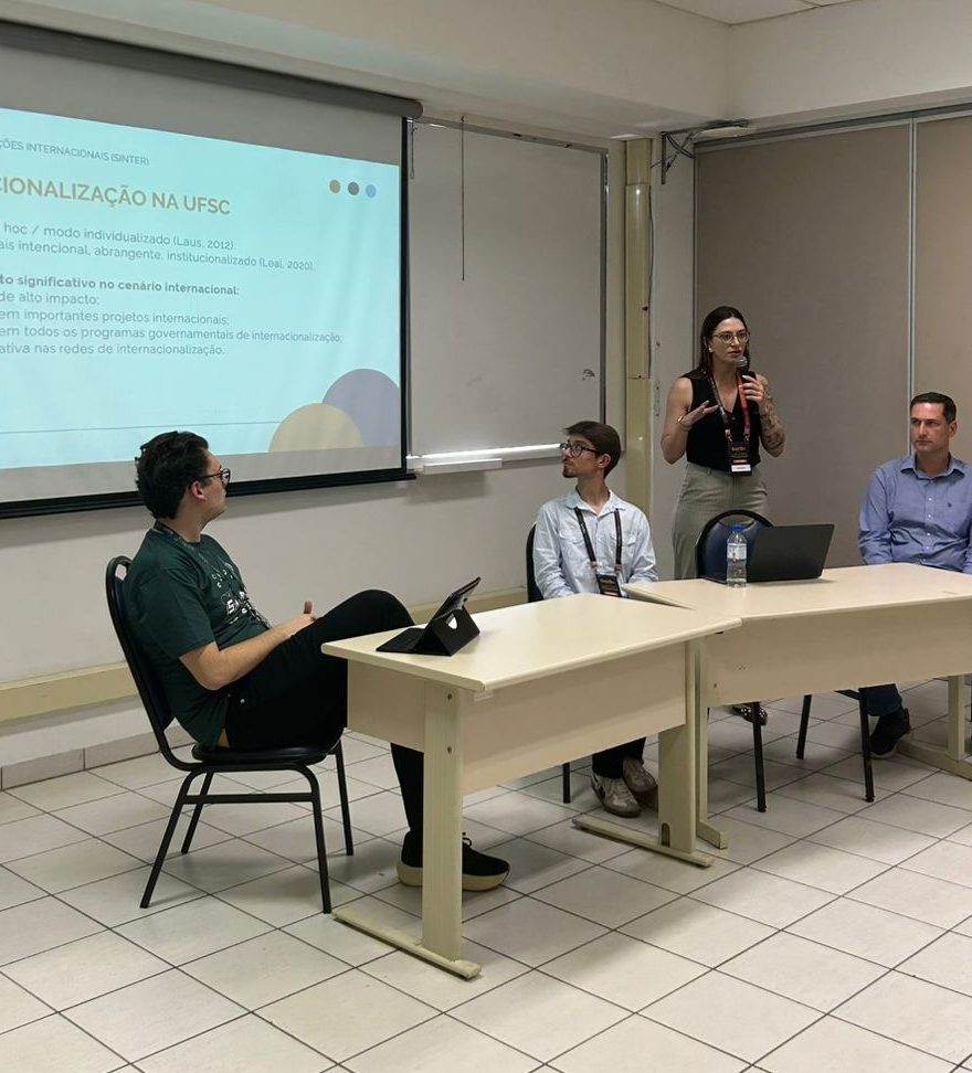 A Secretaria de Relações Internacionais (SINTER), representada pela diretora Dra. Fernanda Leal, participou nesta segunda, 29 de setembro, da Mesa Redonda “Intercâmbios e internacionalização de estudantes” da Semana Acadêmica de Engenharia Química e de Alimentos da UFSC (SAEQA 2025), que trouxe como tema “25 anos de história: Fragmentos do passado que movem as engrenagens do futuro”.