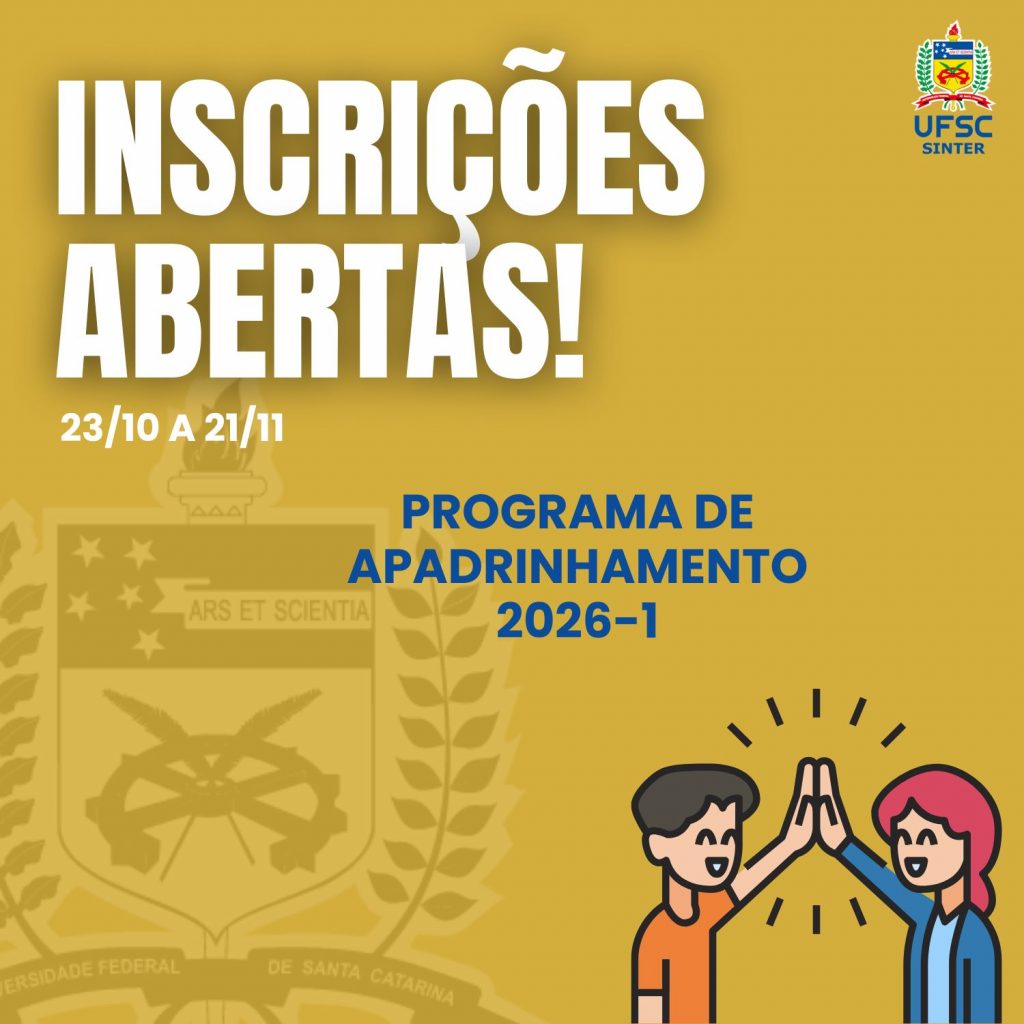 A Secretaria de Relações Internacionais (SINTER) da Universidade Federal de Santa Catarina (UFSC) convida todos os estudantes da instituição a participarem do Programa de Apadrinhamento 2026.1, uma iniciativa que busca integrar e apoiar estudantes internacionais durante sua estadia em Florianópolis e na UFSC.