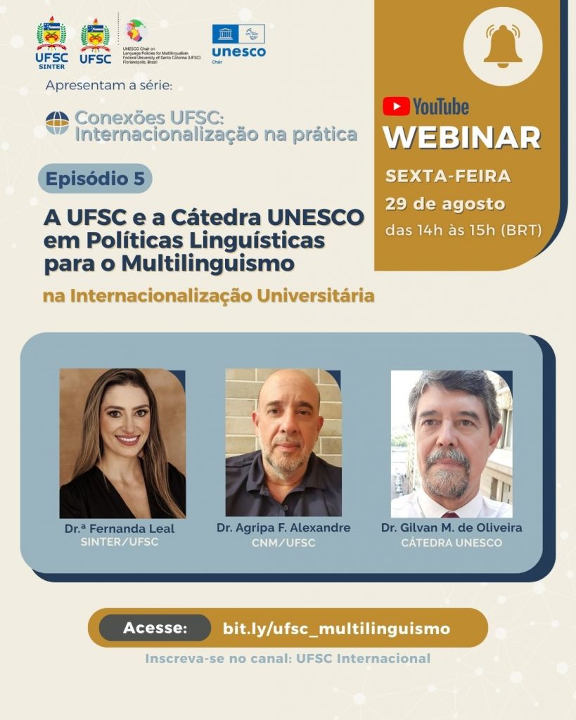 A Secretaria de Relações Internacionais (SINTER/UFSC) promove o Episódio 5 da série “Conexões UFSC: Internacionalização na prática”. O webinar será realizado no dia 29 de agosto (sexta-feira), das 14h às 15h (horário de Brasília), com transmissão ao vivo pelo canal
