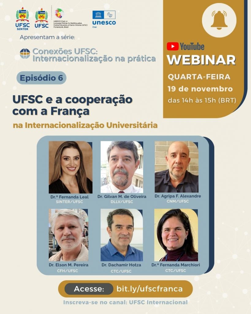 O sexto episódio do webinário “Conexões UFSC: Internacionalização na prática” acontecerá ao vivo no dia 19 de novembro de 2025, quarta-feira, às 14 horas, e terá como tema “UFSC e a cooperação com a França”. A transmissão poderá ser acompanhada no canal do YouTube “UFSC Internacional”.